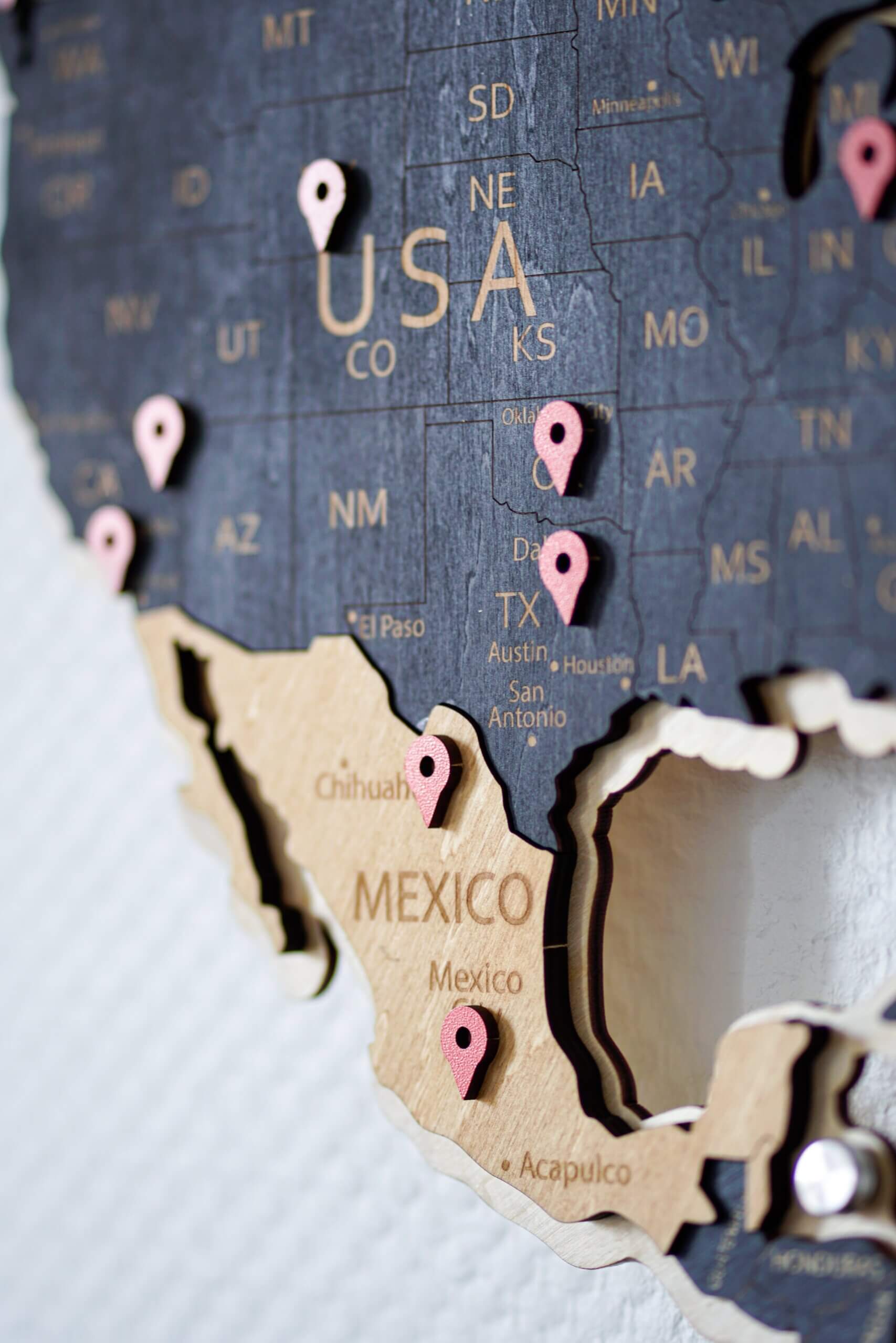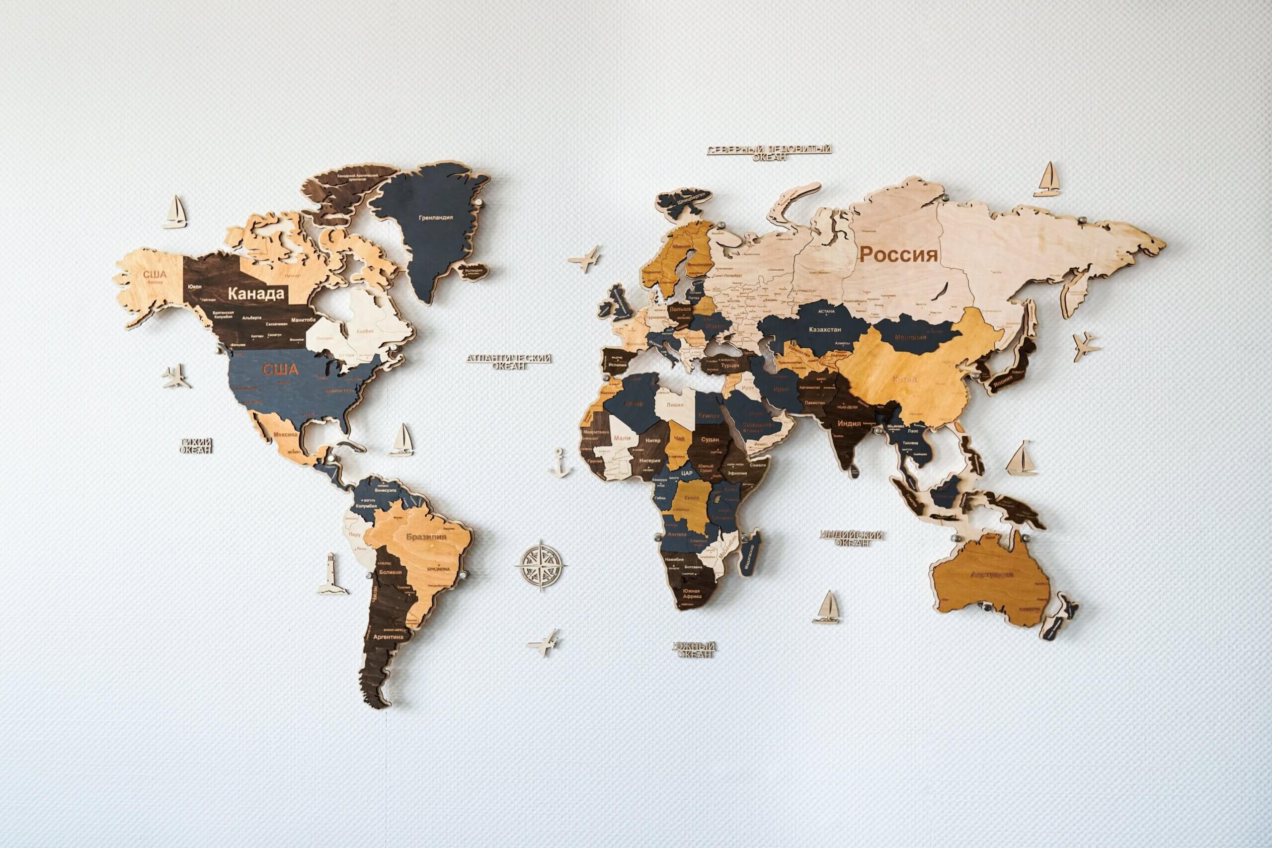 Для наших карт можно отдельно докупить подложку для увеличения объема, подсветку для красоты, набор надписей для океанов, геометки или набор флагов-пинов.